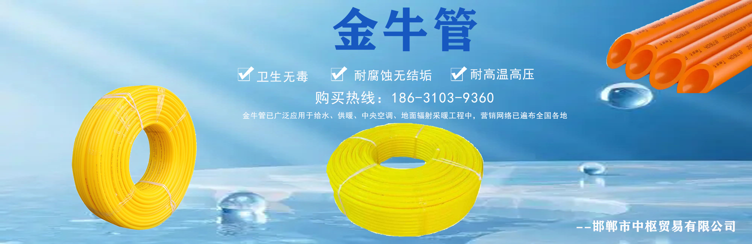 邯鄲市中樞貿易有限公司主營日豐管,日豐管代理,日豐管廠家批發,金牛管,金牛管代理,金牛管廠家批發等,質量可靠,值得信賴!  我公司在產品行業積累了豐富的經驗,具有嚴格的管理制度,同時引進先進的生產設備和生產技術,一如既往的為廣大客戶提供質優價廉的產品。創辦多年來在市場上贏得較好的口碑,銷售網絡覆蓋全國各個省市及地區。  質量為先,信譽為重,管理為本,服務為誠,我們將致力于這一經營理念,關注時代發展,用先進的技術,不斷創新求實,以更優的質量,更好的服務來滿足我們的廣大客戶。  公司理念:勇于進取、開拓創...